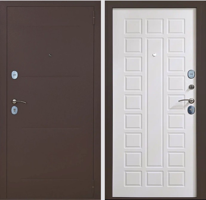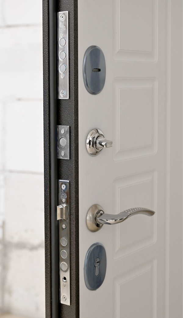 Комплектация: дверной глазок AVERS, ночная задвижка, фурнитура хром овальная, ручка раздельная, форма 26, декоративные накладки с защитой от продувания, комплект ключей.