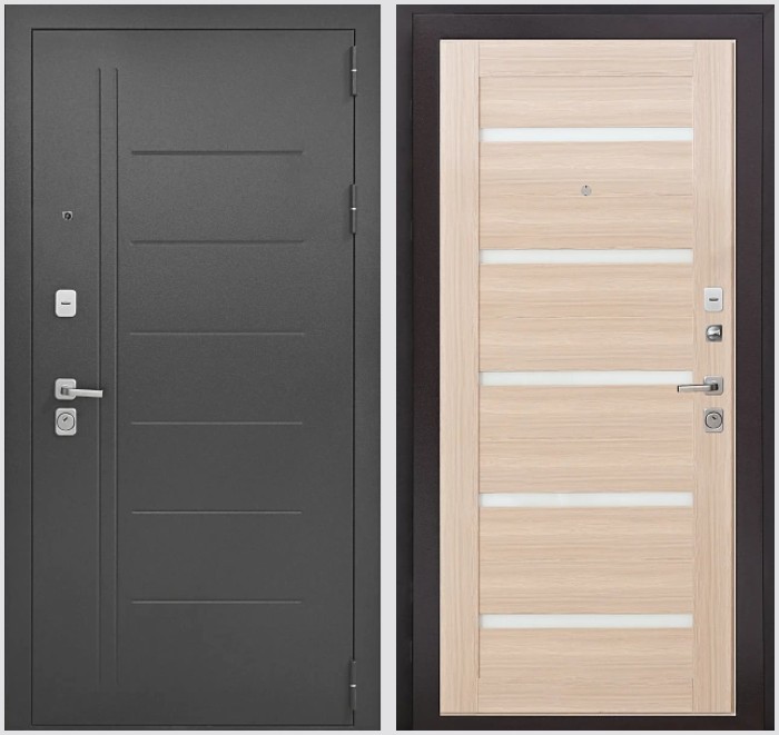Комплектация:дверной глазок, ночная задвижка, порог из нержавеющей стали, фурнитура матовый хром прямоугольная, 17 серия, декоративные накладки с защитой от продувания, комплект ключей.