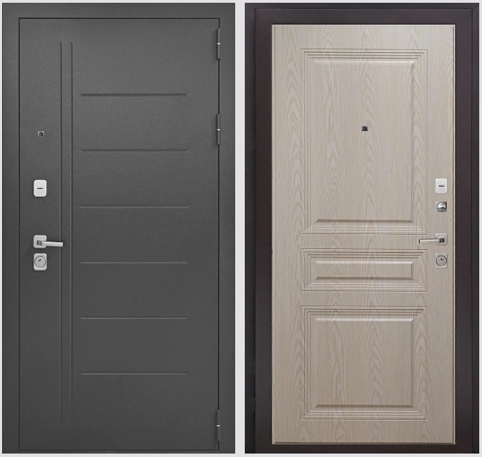 Комплектация:дверной глазок, ночная задвижка, порог из нержавеющей стали, фурнитура матовый хром прямоугольная, 17 серия, декоративные накладки с защитой от продувания, комплект ключей.