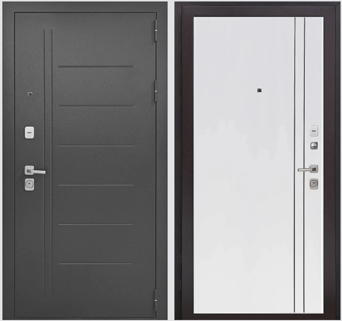 Комплектация:дверной глазок, ночная задвижка, порог из нержавеющей стали, фурнитура матовый хром прямоугольная, 17 серия, декоративные накладки с защитой от продувания, комплект ключей.