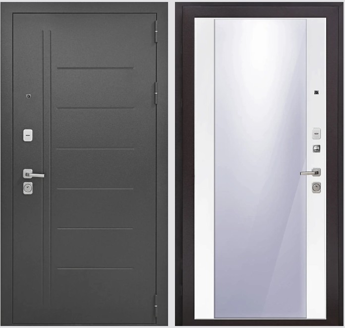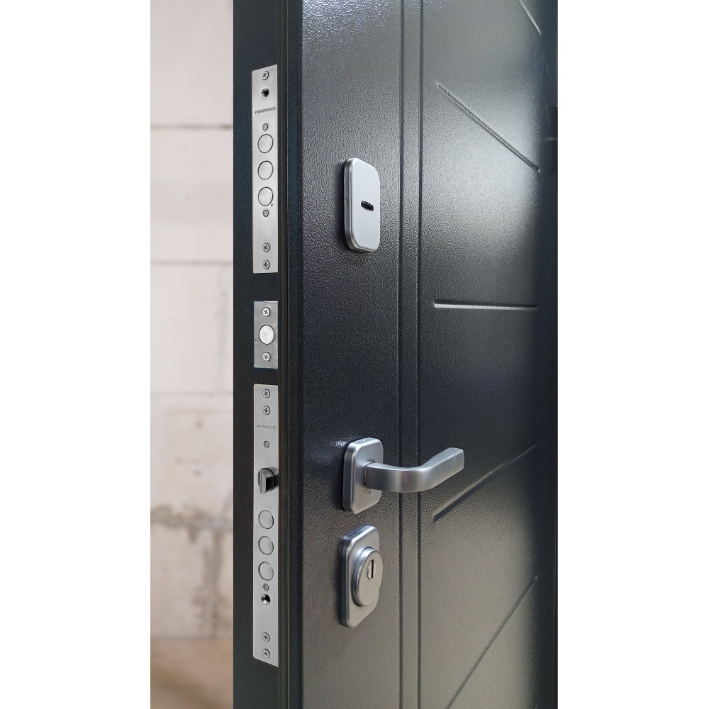 Комплектация: дверной глазок, ночная задвижка, порог из нержавеющей стали, фурнитура матовый хром прямоугольная, 17 серия, декоративные накладки с защитой от продувания, комплект ключей.