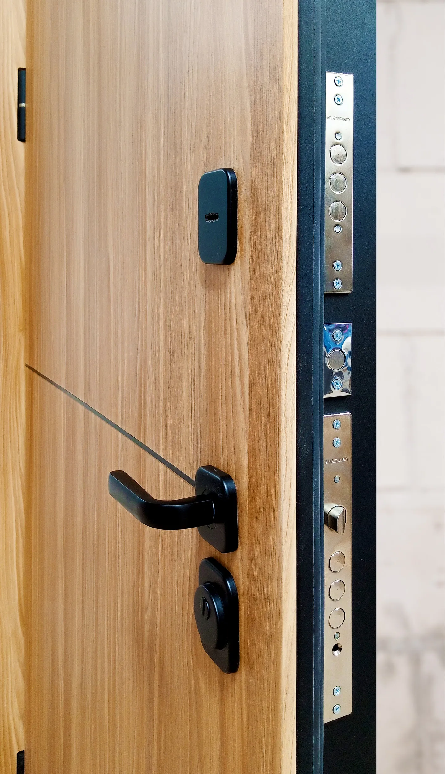 Комплектация: дверной глазок, ночная задвижка, фурнитура черная прямоугольная 17 серия, декоративные накладки с защитой от продувания, порог из нержавеющей стали, комплект ключей.
