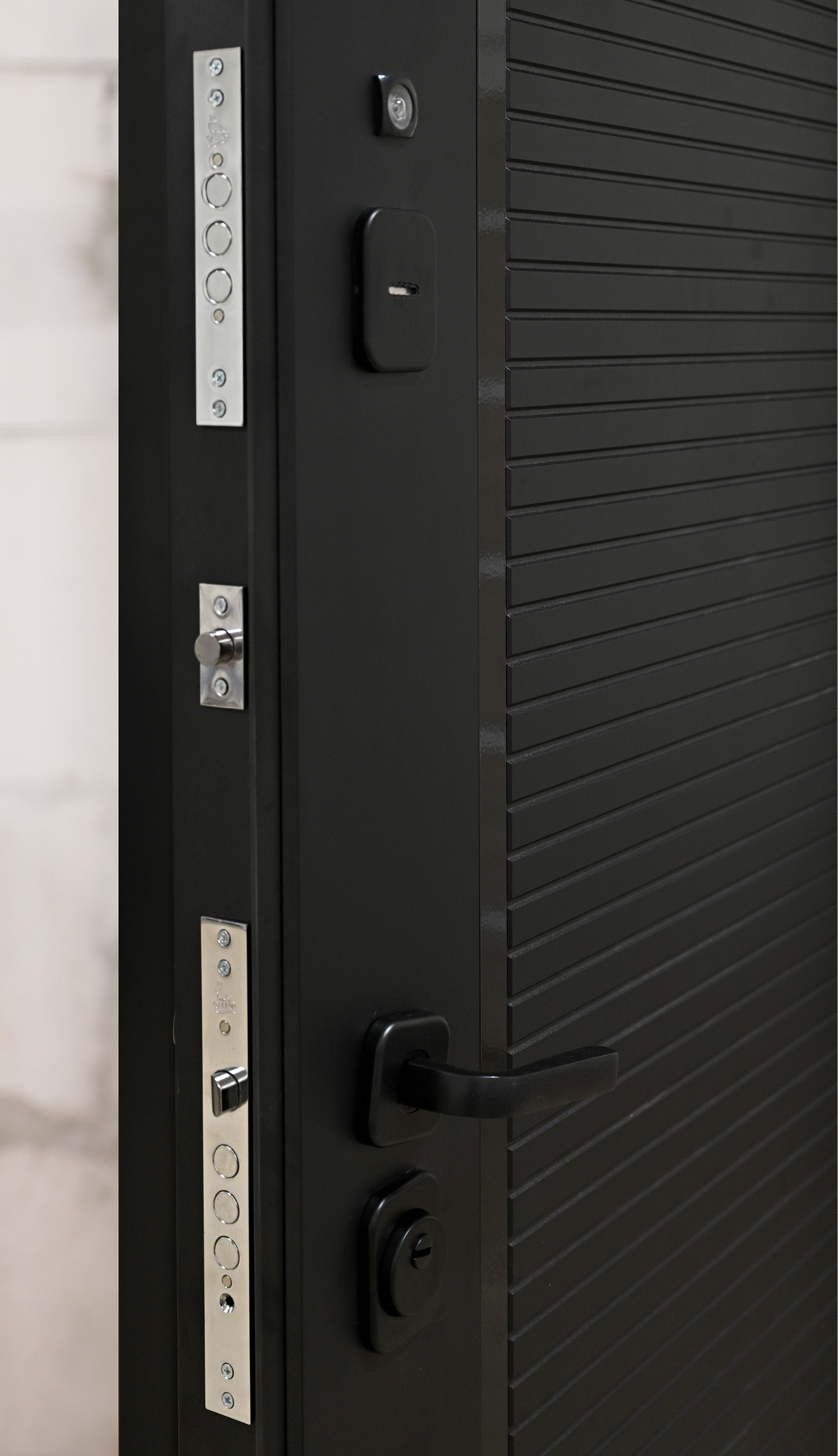 Комплектация: дверной глазок, ночная задвижка, ключ-вертушок, фурнитура черная прямоугольная 17 серия, декоративные накладки с защитой от продувания, комплект ключей.