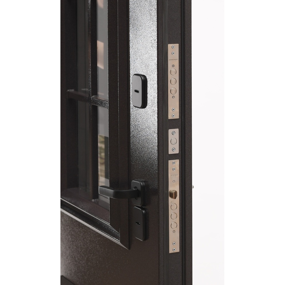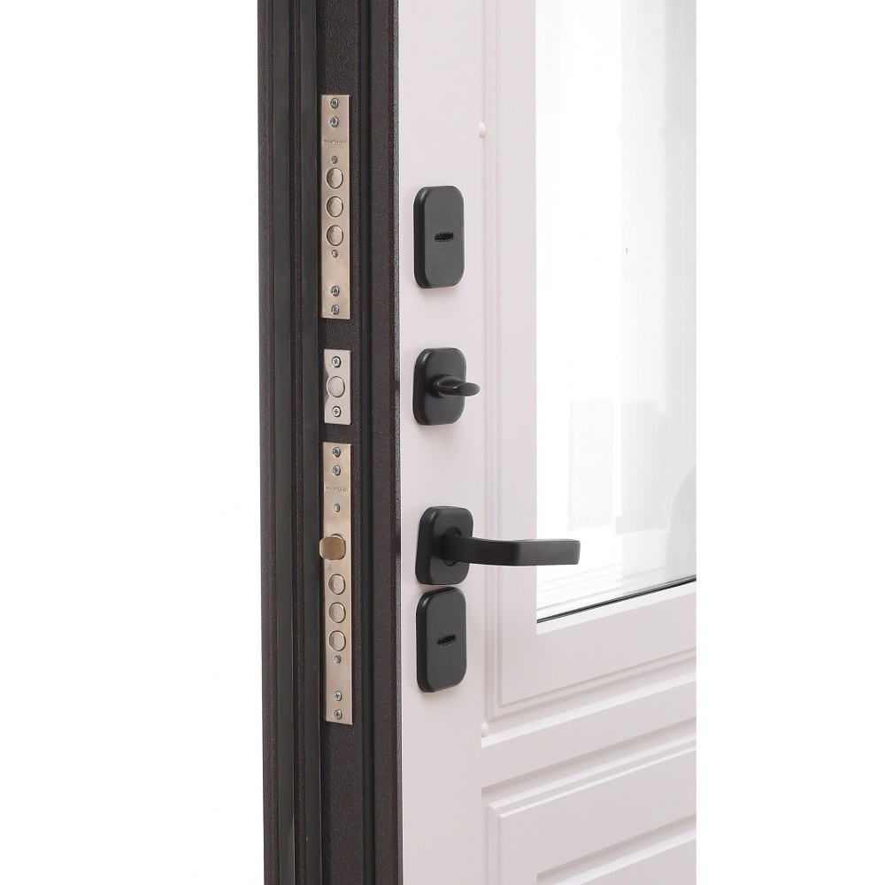 Комплектация: ночная задвижка, фурнитура черная прямоугольная 17 серия, декоративные накладки с защитой от продувания, порог с накладкой из нержавеющей стали, комплект ключей.