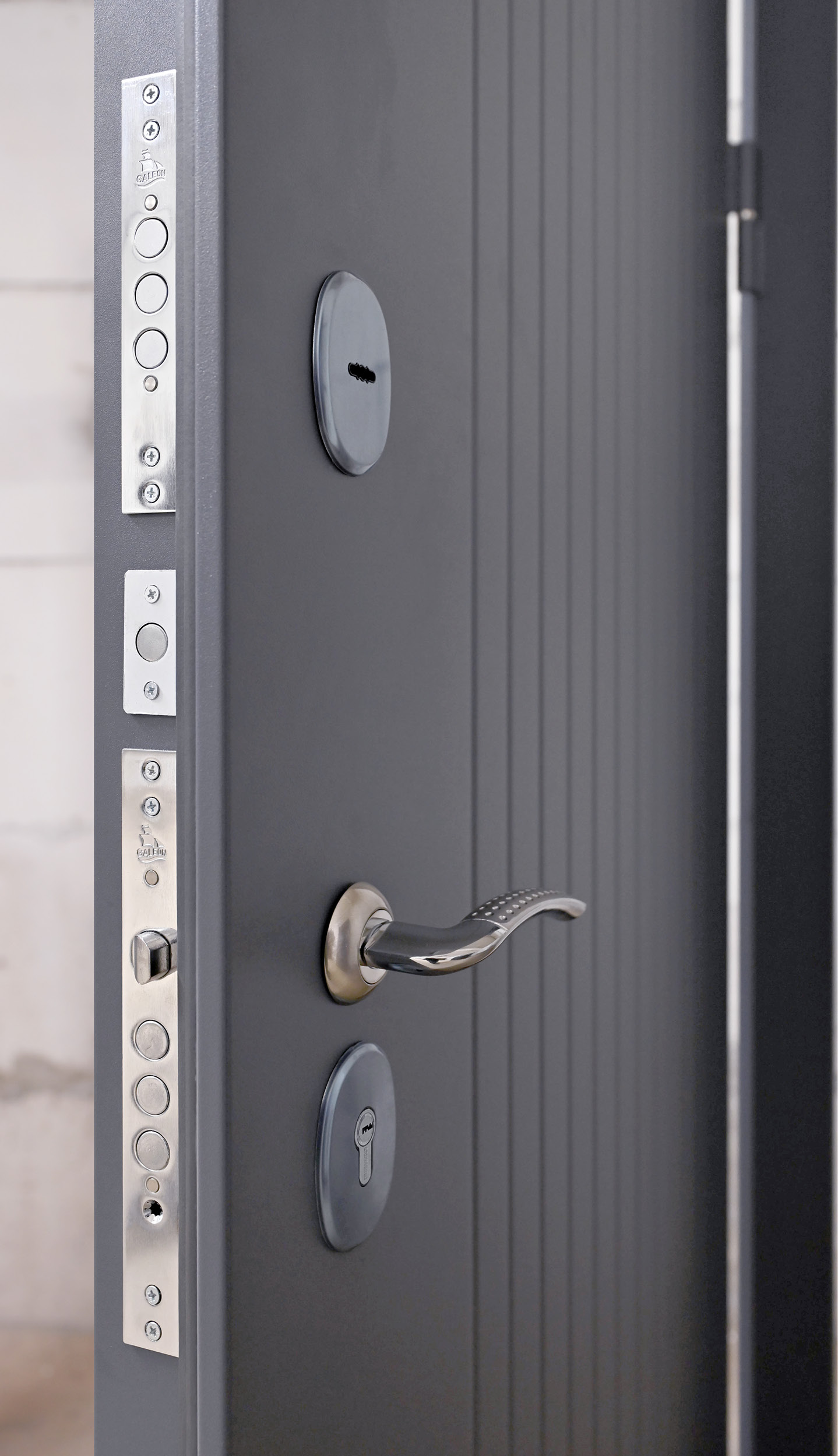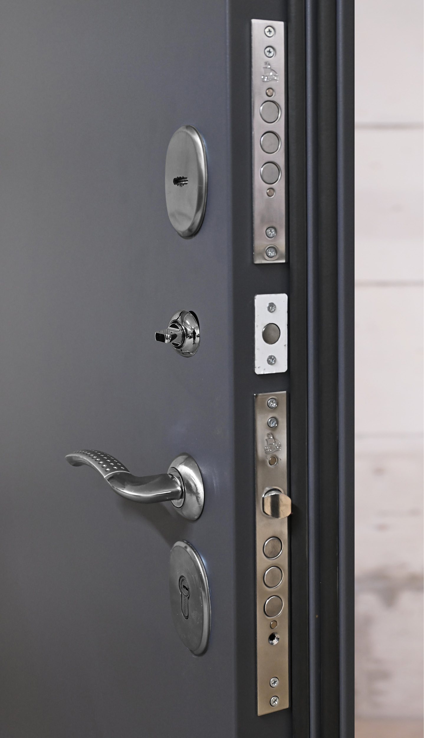 Комплектация: дверной глазок, ночная задвижка, ключ-вертушок, фурнитура хром овальная, декоративные накладки с защитой от продувания, комплект ключей.