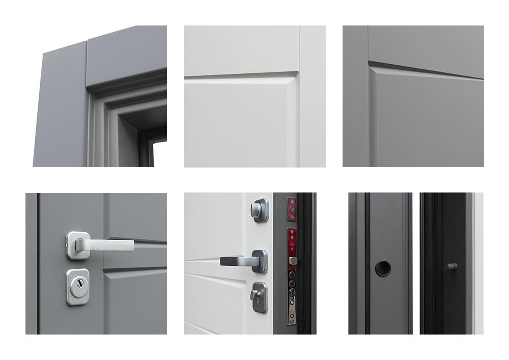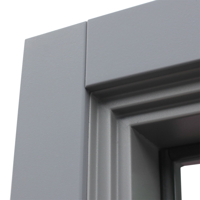 Внешняя отделка-Лист металла 1,5 мм. Экошпонированная панель МДФ 10 мм. Объемная фрезеровка. Цвет "силк титан". Наличник МДФ 80 мм.