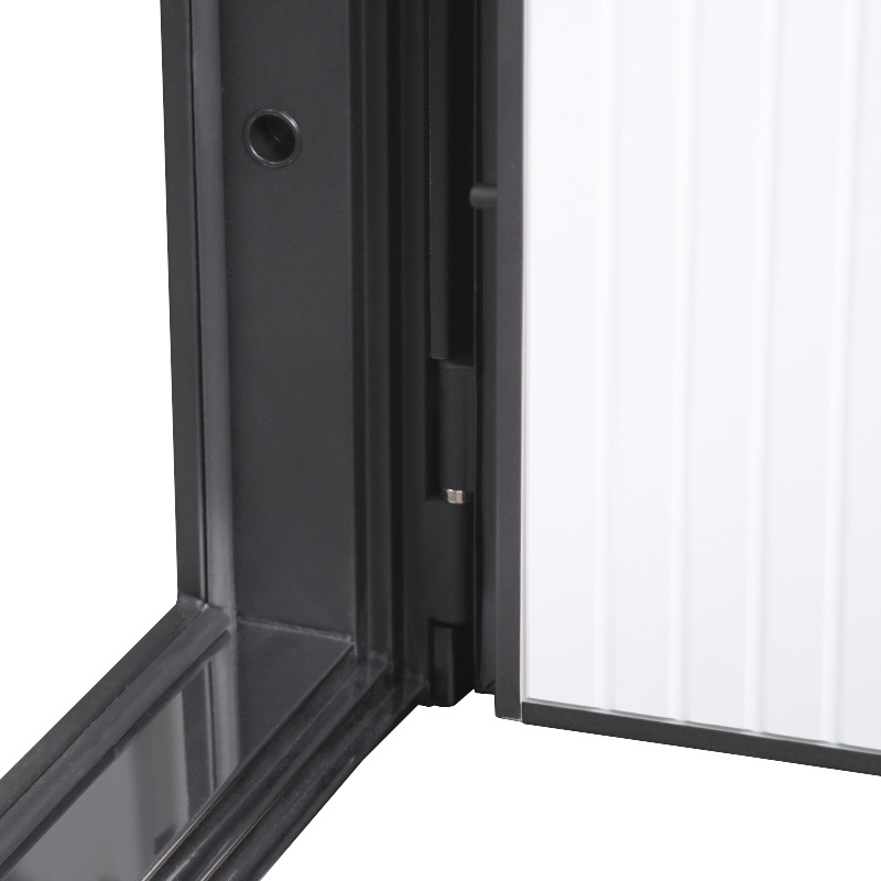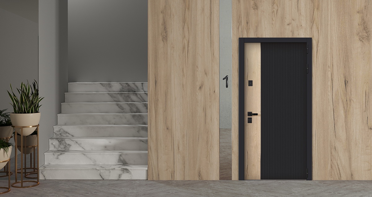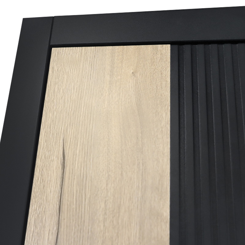 Внешняя отделка - Лист металла 1,5 мм. Экошпонированная дизайнерская панель МДФ 10 мм. Линейная фрезеровка. Цветовая комбинация: «шагрень черная» , замковая часть "дуб галиф натур". Наличник МДФ гладкий 80 мм., цвет "черный кварц".